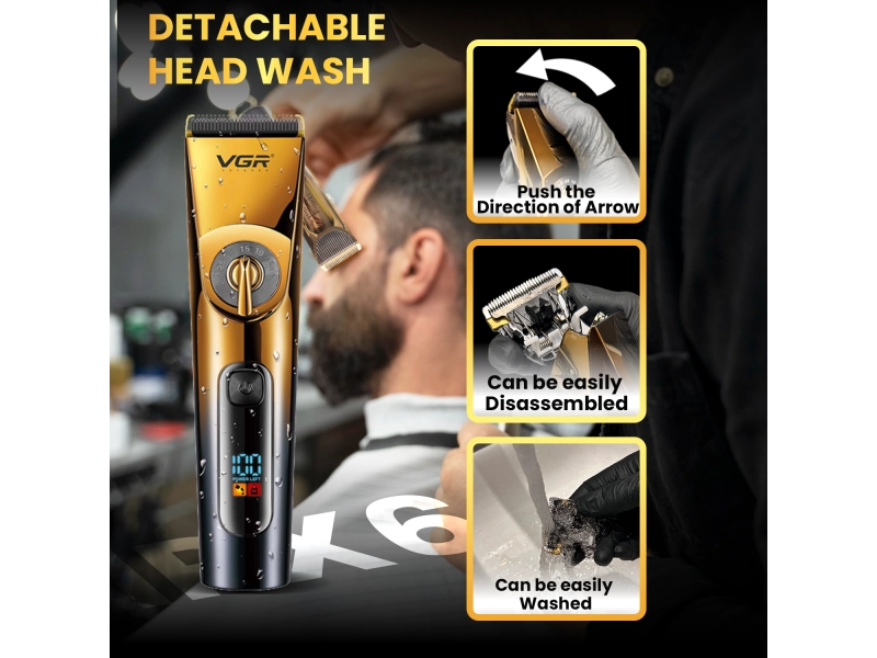 VGR 663 е безжична машинка за подстригване с елегантен златисто-черен дизайн, която може да се използва както в салони за красота, така и у дома. Машинката е лесна за употреба и е снабдена с мощен мотор и керамично острие, което позволява бързо и лесно подстригване.VGR 663 включва пет приставки с различни размери и врътка за регулиране на височината на ножа - от 0.5 до 2.5mm., с които можете лесно да контролирате дължината на косата, която искате да подстрижете и да създавате различни прически.Машинката се зарежда посредством USB кабел включен в комплекта. Характеристики:Функция за заключване на бутона за включване/изключване - Travel Lock;Дисплей с визуализация на оставащата батерия;Време за зареждане: около 3 часа;Време за използване: 200 минути;Капацитет на батерията: 2000mAh;Зареждащо напрежение: 5V-1A;Възможност за регулиране на дължината 0.5-2.5мм без приставка.Степен на защита от вода: IP X6Комплектът включва:1 х машинка за подстригване;1 х четка за почистване;5 х приставки с дължина 3 / 4-6 / 7-9 / 10-12 / 16-18 мм.;1 х USB кабел за зареждане;1 х предпазно капаче за острието1 х масло за смазване;1 х ръководство на потребителя.