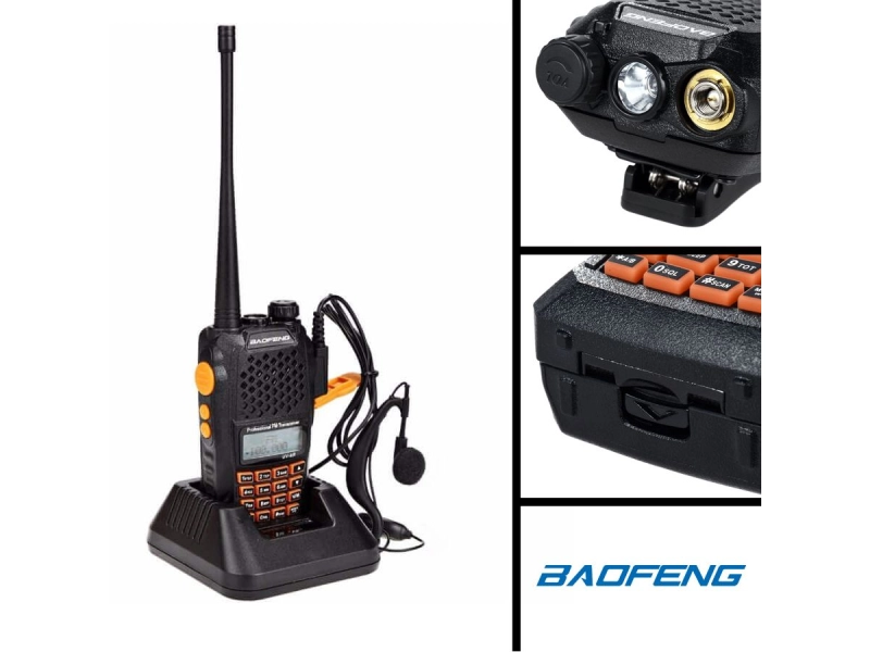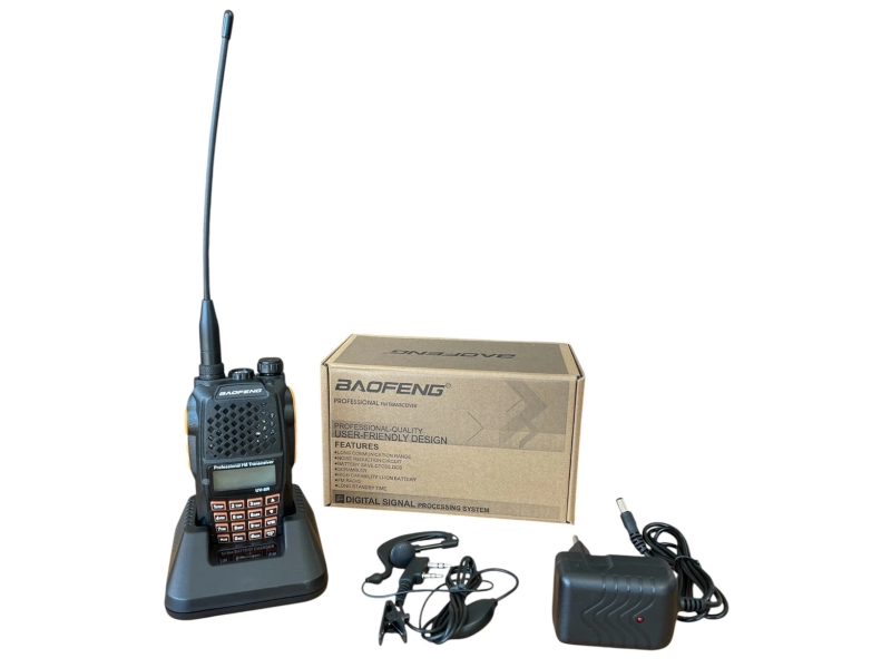 Радиостанцията е окомплектована с литиево-йонна батерия с капацитет 5000mAh и зарядно устройство, както и комфортно хендсфрии. Може да се ползва в широк температурен диапазон – от -30 до +60 градуса.Лесна за употреба дори от начинаещи. Удачен избор е за хора, чиято работа или хоби налагат използването на такъв тип устройства – ловци, риболовци, къмпингуващи, планинари, скиори, радиолюбители, офроудъри, охранители, служители в търговски комплекси или молове и други.Комплектa включва:UV-6R радиостанция (VHF136-174Mhz UHF 400-520Mhz)7.4V 5000mah Li-ion презареждаема батерияантена 136-174/400-520Mhzщипка за коланупътваненастолно зарядно ( 100V ~ 240V )PTT слушалка с микрофон тип хендсфриХарактеристики:честотен обхват: 136-174 / 400-520 MHzчестоти VHF/UHF с двустранно радио предаване 136-174/400-520Mhzdual-Band Displaydual Freq. Display Dual-Standbyизходяща мощност: 7 Wброй канали: 128 (50 CTCSS и 104 CDCSS)led фенер – LED Flashlightголям LCD дисплейhight /Low RF Power Switchableпревключване между Високи и Ниски радио честоти 25KHz/12.5KHzSOS алармааларма за ниско ниво на заряда на батериятафункция за пестене на енергиятаtime-out таймерзаключване на клавиатуратаmonitor Channelстъпка за всеки следващ канал: 2.5/5/6.25/10/12.5/25KHzслушане на определен каналROGER SET