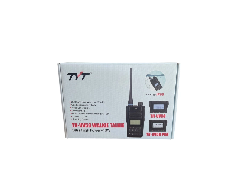 Радиостанция TYT TH-UV58 10W VHF/UHF - Професионална двулентова връзка 📡Насладете се на стабилна комуникация с TYT TH-UV58, оборудвана с мощност 10W, двулентов VHF/UHF режим и IP68 защита за работа в най-тежки условия.Мощност и обхват 💪 10W изходна мощност за обхват до няколко километра Двойно изчакване и двоен режим на готовност за едновременно следене на две ленти Вградено шумопотискане за кристално чист звук Удобни функции и контрол 🎛️ 200 запаметени канала за бърз достъп DTMF кодиране и декодиране на ключови честоти 2-тона и 5-тона сигнали, функция "горене" (TOT) и "синигер" за аварийни повиквания Зареждане и издръжливост 🔋🛡️ Мултифункционално зарядно: настолно и Type-C порт IP68 прахо- и водоустойчив корпус за употреба навън Батерия с голям капацитет и режим за пестене на енергия Какво включва комплектът 📦 1× Радиостанция TYT TH-UV58 1× Литиево-йонна батерия 1× Антена и скоба за колан 1× Настолно/Type-C зарядно устройство 1× Ръководство за употреба