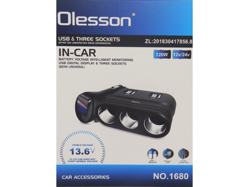 Разклонител за запалка Olesson 1680, 3 гнезда, 4 USB, вграден