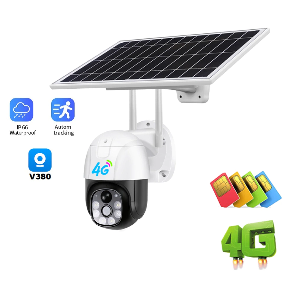 Соларна 4G/WiFi камера с безжично проследяване и слот за SIM карта с висока резолюция 3MP Соларната 4G/WiFi камера с безжично проследяване е иновативно решение за видеонаблюдение на открити пространства, където електрическото захранване е ограничено или невъзможно. Тази камера осигурява надеждно и качествено видеонаблюдение с висока резолюция от 3 мегапиксела и предлага множество функционалности, които я правят идеална за сигурност на дома, офиса или други обекти. Основни характеристики Соларно захранване с монокристален панел от 7W, който зарежда вградените 4 батерии 18650 с капацитет 2600 mAh всяка, осигурявайки автономна работа без нужда от външен източник на ток. Висока резолюция 3MP с изображение 1536x2048 пиксела, гарантиращо ясни и детайлни видеозаписи при всякакви условия. Свързаност чрез 4G и WiFi – камерата поддържа мобилна SIM карта и безжичен достъп до мрежа, което позволява дистанционен контрол и наблюдение от всяка точка. Поддръжка на SD карта до 128 GB за съхранение на видео файлове, които могат да се преглеждат по всяко време чрез мобилно приложение. Панорамно въртене (PTZ) – възможност за завъртане в хоризонтална и вертикална посока чрез приложението V380 Pro за оптимален контрол върху наблюдаваната зона. Интерком функция за двупосочна аудио връзка чрез вграден микрофон и високоговорител, позволяваща комуникация с хора в обхвата на камерата. Устойчив корпус на прах и влага, подходящ за външен монтаж и работа в неблагоприятни атмосферни условия. Предимства на соларната 4G/WiFi камера Автономност и независимост от електрическата мрежа благодарение на соларния панел и батериите, което я прави идеална за места без достъп до захранване. Гъвкаво наблюдение с възможност за контрол и преглед на кадри директно от мобилно устройство, независимо къде се намирате. Лесен монтаж без нужда от окабеляване и сложни инсталации, което спестява време и средства. Висока степен на защита срещу външни влияния, гарантираща дълготрайна и безпроблемна работа на камерата. Множество функции за сигурност като проследяване, алармиране и запис, които осигуряват пълна защита на вашия имот. Какво включва комплектът Соларна камера с 3MP сензор за висококачествено видеонаблюдение. Монокристален соларен панел 7W с възможност за оптимално позициониране спрямо слънчевата светлина. Четири сменяеми батерии 18650 с общ капацитет 10400 mAh за дълготрайна безпроблемна работа. Захранващи кабели и монтажни елементи, необходими за лесен и бърз монтаж на избраното място. Ръководство за потребителя с инструкции за инсталация и настройка на камерата и приложението V380 Pro. Не пропускайте възможността да се възползвате от модерна и ефективна система за видеонаблюдение със соларна 4G/WiFi камера, която ви осигурява сигурност и спокойствие навсякъде и по всяко време. Поръчайте сега и защитете своя имот с иновативна технология!