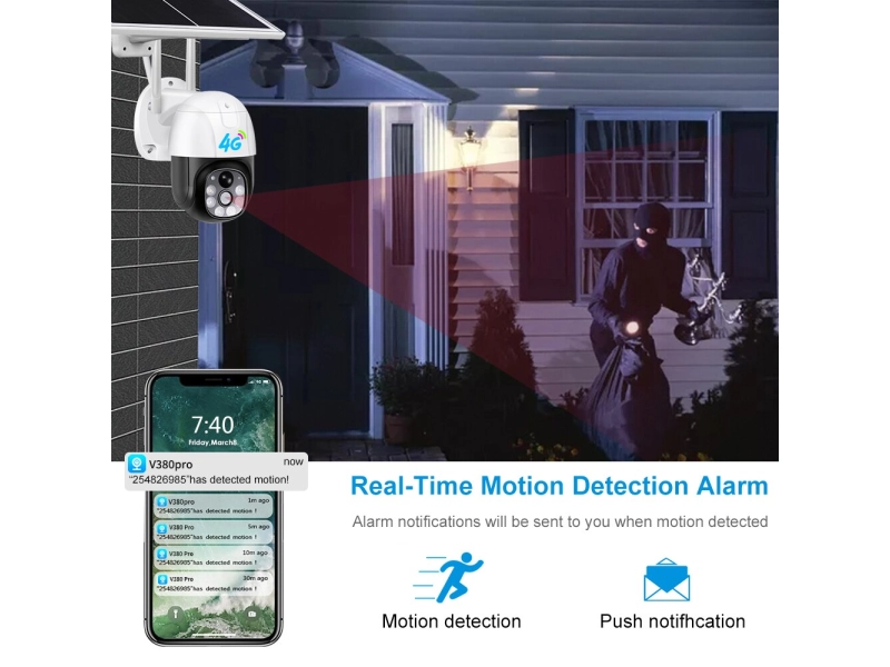 Професионална соларна камера за видео наблюдение, захранваща се директно от слънчевата светлина чрез соларен панел с вградени батерии. Камерата е подходяща за открити пространства където достъпът до електричество е ограничено, а окабеляването нежелано и излишно.Предимства и характеристики:Камерата работи със сим карта от мобилен оператор или WIFI .3 мегапикселова камера с резолюция 1536х2048 осигурява професионално и постоянно качество на изображенията.Въртене на камерата (PTZ) в хоризонтална и вертикална посока директно чрез мобилно приложение V380 Pro.Дистанционно наблюдение на охраняемия обект през мобилен телефон, таблет. WIFI обхват на камерата до рутера - 25 метра (открит терен).Стабилен корпус, прахо и влагоустойчива, което я прави подходяща и напълно удачна за външен монтаж и неблагоприятни атмосферни условя.Работи с безплатно приложение V380 Pro, което може да бъде изтеглено от Google Play или Apple StoreНаличен слот за SD карта с максимален капацитет 128 GB – дава възможност за запис на видео файлове и преглеждането им по всяко време през мобилното ви устройство.Интерком функция- чрез вграден микрофон и говорител се осъществява двустранна аудио връзка между камерата и наблюдателя. Може да чувате звуци от камерата, както и да говорите през телефона си и да се чува от нея.Соларен, монокристален, панел 7W със презареждащи и сменяеми 4 броя батерии 2600 mAh, модел 18650. Общ капацитет 10400mAh. Панелът е подвижен и дава възможност за максимално и оптимално позициониране спрямо слънчевата светлина. Размери на панела: 24х17см.Отлично нощно виждане с обхват до 20 метра и възможност за превключване на изображението в цветен или черно-бял режим.Известие със снимка (notification) през мобилното приложение при наличие на движение в обсега на камерата.Принцип на работа: В покой (когато няма движение) камерата има ниска консумация и по този начин запазва батериите. При наличие на движение автоматично се „събужда“ и започва видеозапис на картата памет. В този момент тя ще ви сигнализира на мобилното ви устройство през приложението. След като обекта премине от обсега й, камерата отново ще премине в „режим на изчакване“ (sleep). Друга възможна опция е да наблюдавате охраняемия обект в реално време като активирате камерата през мобилното си приложение. Тогава тя ще работи до момента, в който не излезете от приложението. Колкото по-интензивно движение има пред нея и колкото повече се наблюдава от телефона, толкова по-голяма е консумацията на батериите. Период в дни на готовност в режим на покой (sleep) без зареждане от солара – 180 дена.Настройки и функции от приложението:Информация за състояние на камерата sleep (режим на изчакване), online.Състояниет на батерията %, индикация за свободно място в картата памет.Опция за гледане в UHD (високо качество) и SD (ниско качество).Playback - Преглеждане на видео записите директно от телефона.Lighting - Опция за смяна на цветно (White light) или чернобяло (infrared) нощно виждане.PTZ - Промяна позицията на камерата хоризонтало 270, вертикално 90 градуса.Rotation speed - Настройка на скоростта на движението на камерата.Време на „заспиване“ на камерата в режим sleep.Record quality - Избор на качество на записваните видео файлове.Hover detection time –време на запис при събитие.Alarm Push – изпращане на известие на телефона при наличието на събитие. При отваряне на известието ви показва снимка от него.Human detection –
