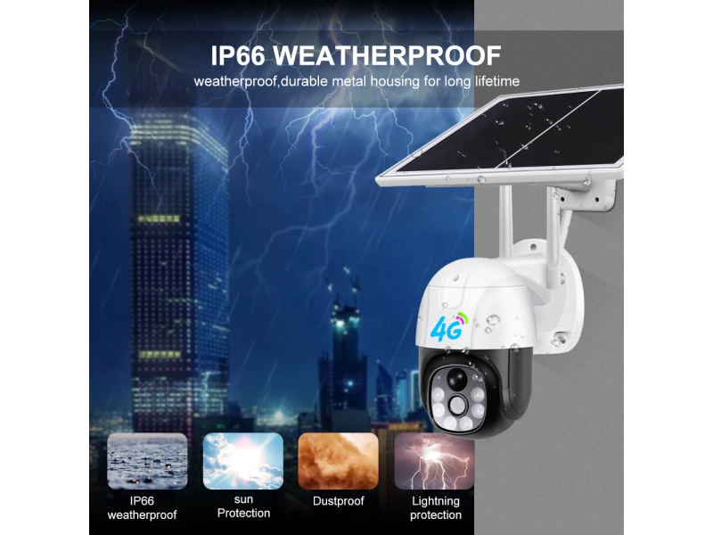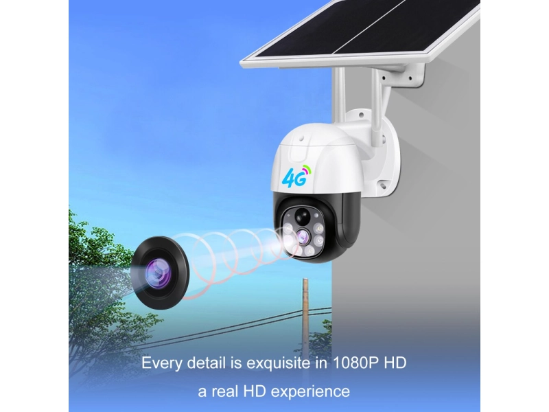 Професионална соларна камера за видео наблюдение, захранваща се директно от слънчевата светлина чрез соларен панел с вградени батерии. Камерата е подходяща за открити пространства където достъпът до електричество е ограничено, а окабеляването нежелано и излишно.