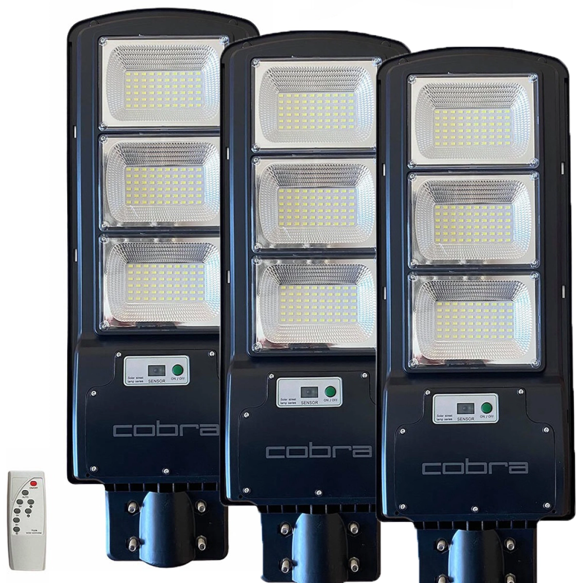 Енергоспестяваща 3-бр. улична соларна лампа JMK COBRA с мощност 450W. Идеална за външно осветление. Поръчай с бърза доставка!