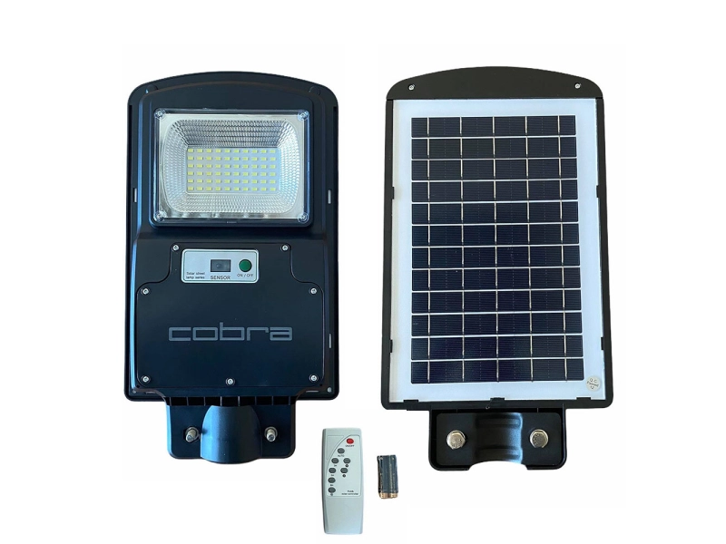 Улична Соларна лампа Cobra от ново поколение! Системата е изцяло автономна, през светлата част на деня се зарежда батерията, а веднага след като се стъмни осветлението се включва автоматично, благодарение на сензорите за светлина, които са в соларния панел. Соларната улична лампа е интелигентна система за външно осветление, която интегрира най-добрите енергоспестяващи части – фотоволтаичен панел, осветително тяло, сензор, контролер и литиева батерия, всичко това в една кутия. През деня високоефективният слънчев панел събира енергия от слънцето и я съхранява в усъвършенстваната литиева батерия. През нощта мощният светодиод автоматично ще се включи, за да осигури светлина. Опция за светене когато се установи движение, COB ще увеличи яркостта, за да осигури изобилие от допълнително осветление за всеки в района.