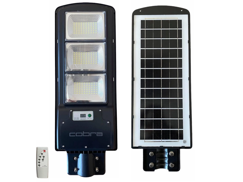 Улична Соларна лампа Cobra от ново поколение! Системата е изцяло автономна, през светлата част на деня се зарежда батерията, а веднага след като се стъмни осветлението се включва автоматично, благодарение на сензорите за светлина, които са в соларния панел. Соларната улична лампа е интелигентна система за външно осветление, която интегрира най-добрите енергоспестяващи части – фотоволтаичен панел, осветително тяло, сензор, контролер и литиева батерия, всичко това в една кутия. През деня високоефективният слънчев панел събира енергия от слънцето и я съхранява в усъвършенстваната литиева батерия. През нощта мощният светодиод автоматично ще се включи, за да осигури светлина. Опция за светене когато се установи движение, COB ще увеличи яркостта, за да осигури изобилие от допълнително осветление за всеки в района. След 20-30 секунди или когато движението вече не е открито, светлината ще се изключи, за да спести енергия. Има опция за насторйка и за постоянна осветеност. Тази интелигентна функция позволява на соларната лампа, захранвана от слънчева енергия, да спестява енергия, когато никой не е в обхват и няма необходимост от светлината, което означава много по-дълго време на работа, отколкото бихте очаквали от подобно соларно осветление. Предимства: добра стабилност дълъг живот на батериите висока ефективност на светлината,от COB диода и лупата лесен монтаж и поддръжка, високи показатели за безопасност, икономия на енергия и защита на околната среда. икономично и практично предимство. Лампата е влагозащитена и подходяща за външен монтаж като осветление за пътищата, паркове, градини, вили, външен паркинг, както и навсякъде, където липсва електрозахранване или има нужда от автономно осветление. Характеристики: COB мощност – 450W 3200 лумина Ъгъл на осветяване 120 градуса Батерия – Li-ion - 20AH Време за зареждане: 6-8 часа при добра осветеност Време на светене: 25-30 часа при непрекъснато осветяване на пълна мощност. Височина на монтиране – 3-5m (препоръчителна) Разстояние между стълбовете(стени) – 10-12m Защита от вода и влага – IP65 Цвят – 6000 К Комплекта включва: Соларна лампа 450W Дистанционно управление