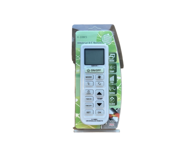 Универсално дистанционно управление за климатик с 108 кода и таймер. Дистанционното управление е подходящо за следните марки климатици: Acson, Adc, Aidelong, Aite, Akira,Amcor,Amico, alpin, Aucma, Aux, Aoke, Aoli, Apton, Baixue,Beijingjingdian, Big-Thumb, Boerka, Boshi, Boshigao,Borler, Caixing, Carrier, Chagfeng, CHANGFU, cHANGLING, Changhong, Chengyuan, Chuanghua, Chuanyan, Chigo, Chunlan, Colrolla,Corona, Crown, Daewoo,Daikin, Dajinxing, Dake, Daotian, delonghi, Dunan,Dongxia, Dongxinbao, Elco, Electer, Electrolux, Fedders,Feiedrich, Feige, Feilu, Ferroli, first, frestech, Fujitsu, galanz, Geer, Glee, Goldstar,Gree, Guangda, Guqiao, Haier, Helton, Hemilton, Hicon,Hisense,Hitachi, Hongyi,Huabao,Huagao, Huake, Huamei, Huanghe, Hualing, Huawei, Huifeng,Hyundai, Inycin,Jiangnan, Jiale, Jimstar, Jinbeijink, Jinda, Jinsong, Johnso, Kangli, Kelong, Klimatair,Konka, Kris, Kt02_D001, Kt02_D002, Kty001,Kty002,Kty003,Kty004,Kty005, LG, Liangyu, Likeaie, Littleswan, Longhe, Loren-Sebo, Mcquay, Md, Meiling, Mingxing, Mitsubishi, Mitsuka, National, Nikko, Niso, Norka, Olympus, Opal, Panda, Pereg, Pinshang, Pilot, Puyi, Qixing, Raybo, Rhoss, Ricai, Rijiang, Rowa, Sacon, Samsung, Sanyo Nec, Sanzuan, Saporo, Sast, Sensor, Serene, Shamei, Shangling, Shanye, Shanxing, Sharp, Shenbao, Shengfeng, Shengfeng/feilu, Shinco, Shining, Shuanglu, Sigma, Sogo, Songlinxia, Songxing, Sova, Sowa, Soyea, Speed, Srtc, Staright-aircon, Sunburg, Tadiair, Tadiran, Taiya, TCL, Teac, Teco, Tianjinkongtiao, Tianyuan, Tobo, Tongli, Toyo, Toshiba, Trane, Uni-air, Uttleduck, Wanbao, Wangzi, Weili, Weiteli, Whirlpool, Wufeng, Xinghe, Xinle, Xinling, Xileng, Xiongdi, Yair, Yaoma, Yidong, York, Yutu, Zapaizuzhuangji, Zhongyi, Zuodan и др.