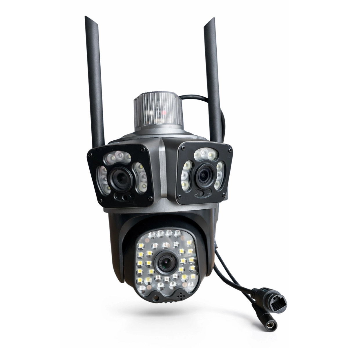 Тази външна въртяща WiFi камера с три обектива и 12MP сензор предлага изключително качество на изображението и широкообхватно наблюдение за всяко външно пространство. Снабдена с 50 мощни диода за нощно виждане, камерата осигурява ясна и детайлна картина дори при слабо осветление, което я прави идеално решение за охрана на домове, офиси и търговски обекти.