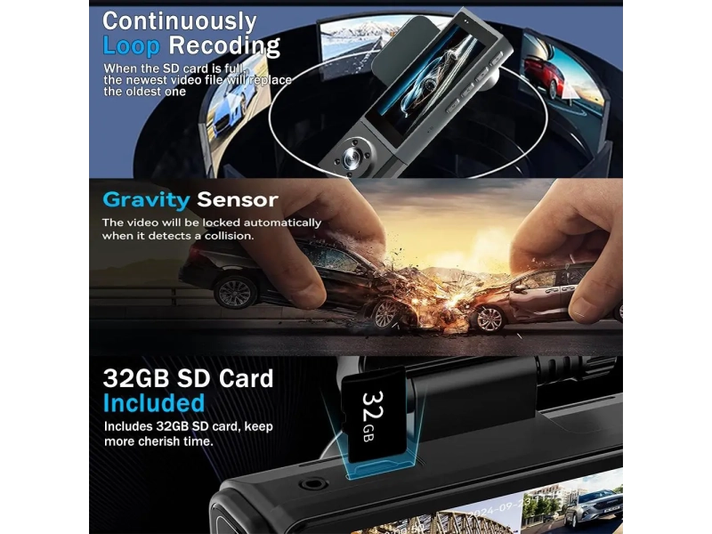 Vehicle BlackBox DVR 1080P е практичен и надежден видеорегистратор с две камери + задна камера , предназначен да осигури сигурност при шофиране и паркиране. Записва с HD видео качество , поддържа цикличен запис , детекция на движение и разполага с вграден G-сензор , който автоматично запазва важните записи при удар или инцидент, за да не бъдат изтрити.