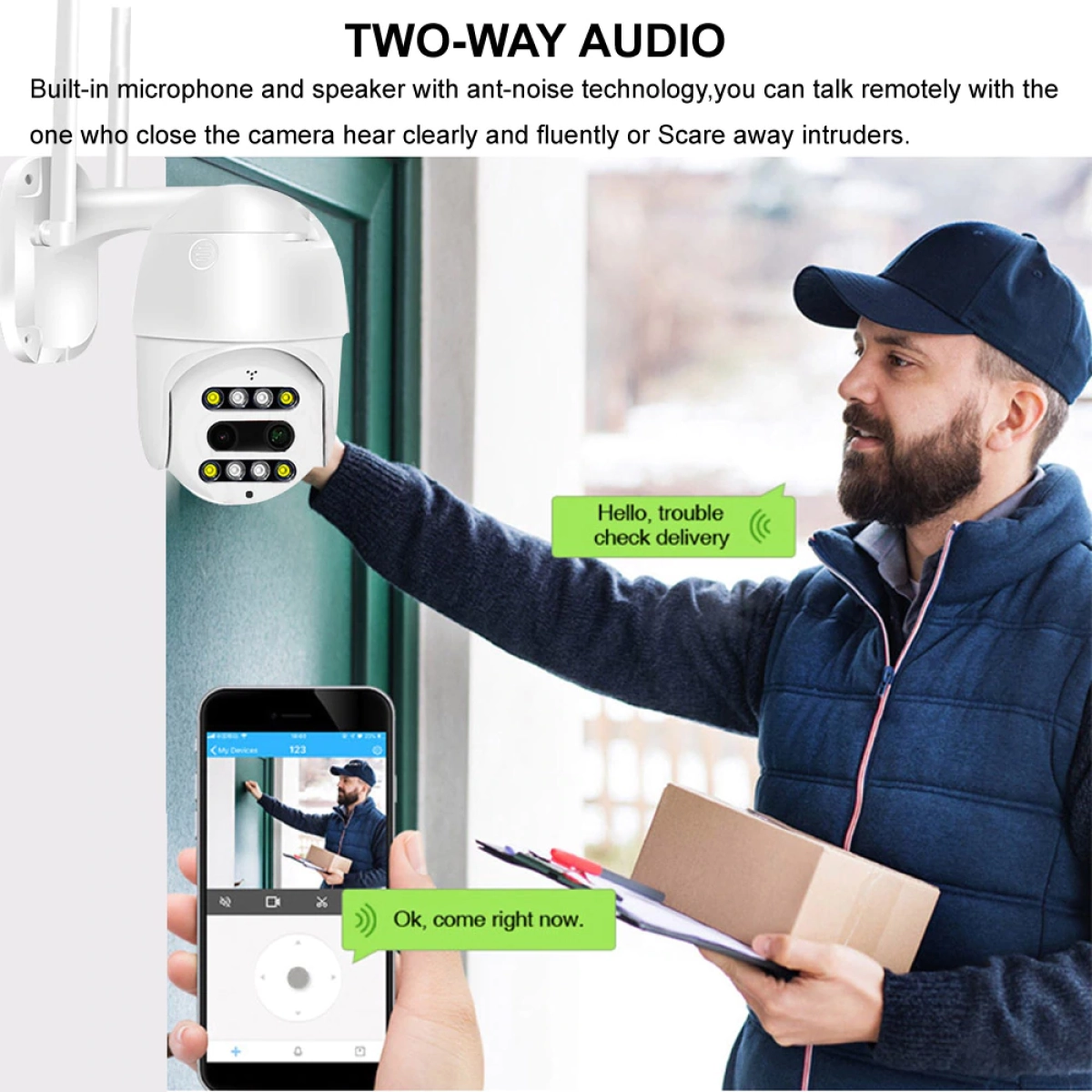 - Двупосочно аудио, което позволява комуникация през камерата