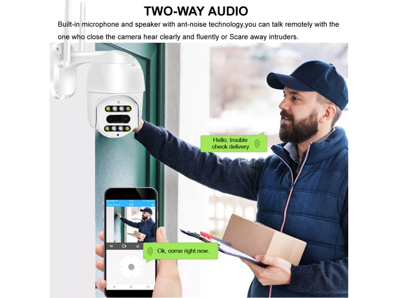 Wifi камерата Dual Lens PTZ e водоустойчива и е подходяща за външни условия, може да се настрой и монтира за няколко минути, без необходимост от допълнителни устройства или кабели. Защитата за водоустойчивост е IP66.
