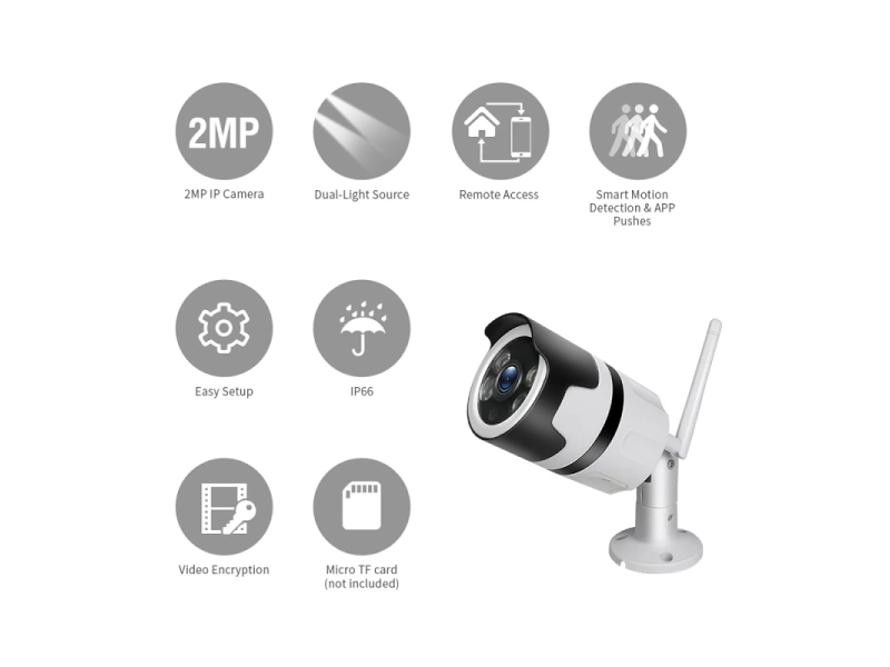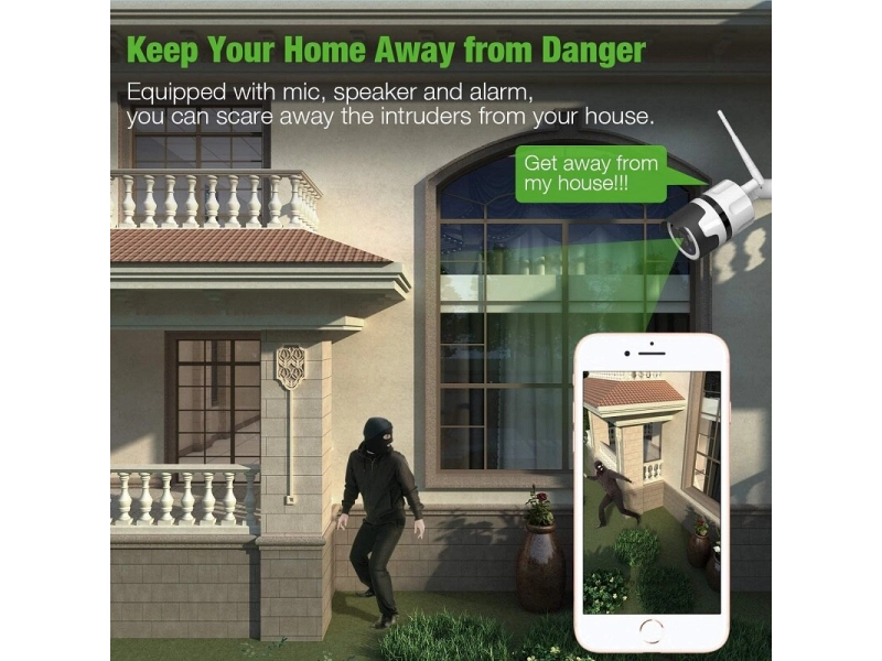 Външна IP WIFI смарт камера Lylu, 5MP, IP65, авто проследяване, водоустойчива, двупосочно аудиоWifi камерата може да се настрои и монтира за няколко минути, без необходимост от допълнителни устройства или кабели. Камерата изпраща нотификации при движение или звук директно на смартфома, чрез приложението с което работи. Автоматичен нощен режим. Наблюдение през мобилни устройства: Android, iOSЗа външен и за вътрешен монтаж.Записване върху микро SD карта и възможност за записване в облак.Камерата се свързва както през Wifi, така и през LanРаботи с приложение за Android и IOS: V380 ProВ комплекта не е включено захранване - адаптер 220 V - DC 12 VМоже да заявите допълнително и адаптер за 8 лв, като опция при изготвяне на поръчката.Предимства:Двупосочен звук: Говорете с посетителите, независимо къде се намиратеРезолюция 5MpIEEE802.11b / g / n Безжична честотаФункция за откриване на движение и автоматично проследяванеWEP / WPA-PSK / WPA2-PSK криптиране Безжична защитаMicro SD до 128GBПоддържа Android и IOS устройстваПроектирани да добавят допълнителна сигурност вкъщи, във вашите ресторанти, магазини, офиси и т.н..ХарактеристикиDC:12V±5% Input Power2.4~2.4835 GHz Wireless Frequency355°/85° Pan/Tilt5.0M pixel HD CMOS Image Sensor3.6mm LensH.264/MJPEG Video Compression10 meters Night Vision25-30fps Frame RateTwo-way AudioWEP/WPA-PSK/WPA2-PSK encryption Wireless SecuritySD up to 128GB Storage (not included)Protection Rating: IP65Комплекта включва:1 бр. Безжична камера WIFI HD IP/P2P camera 5MP.1 бр. WI-FI Антена1 бр. Комплект крепежни елементи.1 бр. Упътване на английски език.