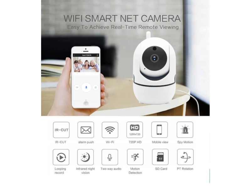 Удобна, красива и лесна за работа! WiFi IP Камера Въртяща се 360° Full HD с Нощно Виждане и двупосочен звук. Идеално решение за дома!Резолюция: Full HD 1080p 2 Мегапиксела – запис със звукЗахранване: Чрез захранващ адаптер (включен в комплекта)Свързване: Чрез WiFi и Приложение за Телефон, сваля се от Android store или App Store. Съвместим с всички Android и Apple устройства.Управление: Със смартфон само с интернет връзка. Обектив 3.6 mm 80 ° широкоъгълен обектив Настройка на PTZ панорамен / наклонен (355 ° хоризонтален и 110 ° вертикален) Изображение HD 1080p / 2.0MP сензор за изображение Компресия на видео H.265 HD видео качество и масово съхранение Ден / нощ IR-CUT филтър за автоматично превключване IR светлина 4бр. IR LED диода Частота на кадрите 25fps ± адаптиране към интернет Име на модела: Wifi 360 Camera full hd Захранване 12v Тип на връзката: Wireless Микрофон: Да Гаранция: 1 година/ 12 месеца Цвят: White Характеристики: 360 градуса въртене от телефона; Сензор за движение; Следене на подвижен обект; Инфрачервено нощно виждане; Телефонни известия – push notifications; Възможност за бебефон или уоки-токи; Възможност за прикрепване към стена. Материал: Висококачествен ABS Запис: На карта памет до 32GB или Облачно съхранение Нощно време обхват: 10 метра Съвместимост: Android, iOS и Windows приложения Размер: 8.5 х 11 х 6.5 см Внимание! В комплекта не е включена SD карта за запис (камерата излъчва сигнал и работи и без нея).Wifi IP Камерата предлага високо качество за цената си и набор от функции, които много професионални охранителни камери нямат.На първо място – Камерата е моторизирана и може да се върти на 360 градуса по хоризонталата и 90 градуса вертикално. Всичко това може да го прави автоматично (следи движещ се обект) или ръчно от потребителя (с плъзгане на пръст по дисплея на телефона). Може да променяте постоянният ъгъл на наблюдение само с едно движение на пръста. Може от време на време да разгледате обекта/стаята , която се наблюдава, като направите панорамна обиколка.IP Камерата разполага с инфрачервено (IR) нощно виждане.Дори да няма никаква светлина в стаята, т.е. при пълен мрак – камерата ще може да заснема случващото се до 10м от себе си.Как става това? Когато светлината в стаята намалее, или лампите се угасят, камерата автоматично ще премине в нощен режим. Филмът ще бъде заснет с черно-бял кадър, но всичко ще се вижда ясно и отчетливо. -Известия на телефона при засечено движениеМоже да получавате известия на телефона си при засичане на движение от камерата. И не само това, но ще получите и запис на движението още когато то е започнало (алармен запис), а не когато си видите телефона и се свържете към камерата. Можете да настроите да получавате тези известия (push notifications) в определено време. Например между 19:00 и 08:00 когато няма никой в магазина ви. Или между 08:00 и 17:00 когато няма никой вкъщи, за да не ви безпокои постоянно, когато има някой, който постоянно преминава пред камерата.-Бебефон или Уоки-ТокиТази страхотна IP Камера е с вграден високоговорител и микрофон, т.е двупосочен интерком. Благодарение на двупосочното аудио, WiFi камерата предлага възможност за водене на разговори с наблюдавания обект. Може да чуете когато вашето бебе се разплаче в другата стая или да се скарате на кучето си ако прави някоя пакост, дори да се намирате на другия край на града/света.Как да инсталирате Wifi IP Камерата?1. Изтеглете приложението според вашата операционна система от 