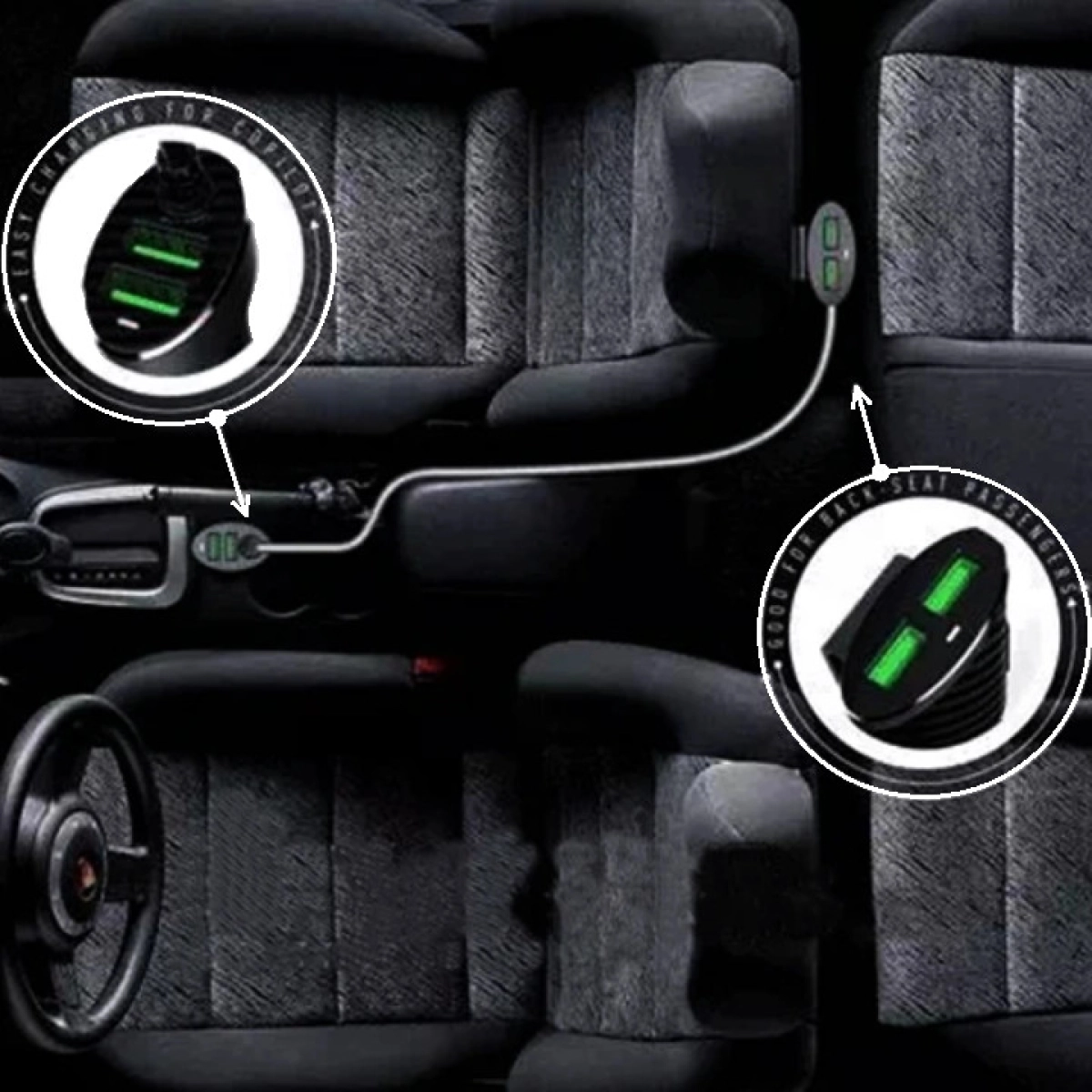 - Два USB порта са разположени отпред за водача и пътника на предната седалка, а два допълнителни порта с удължител са предназначени за пътниците на задните седалки.