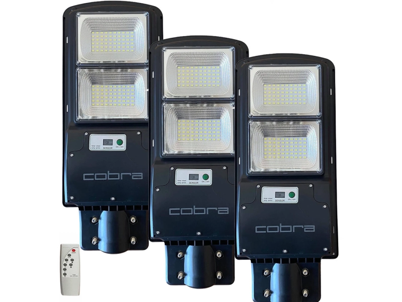 Пакет 3бр. Улична Соларна Водоустойчива лампа Cobra от ново поколение! Системата е изцяло автономна, през светлата част на деня се зарежда батерията, а веднага след като се стъмни осветлението се включва автоматично, благодарение на сензорите за светлина, които са в соларния панел. Соларната улична лампа е интелигентна система за външно осветление, която интегрира най-добрите енергоспестяващи части – фотоволтаичен панел, осветително тяло, сензор, контролер и литиева батерия, всичко това в една кутия. През деня високоефективният слънчев панел събира енергия от слънцето и я съхранява в усъвършенстваната литиева батерия. През нощта мощният светодиод автоматично ще се включи, за да осигури светлина. Опция за светене когато се установи движение, COB ще увеличи яркостта, за да осигури изобилие от допълнително осветление за всеки в района.