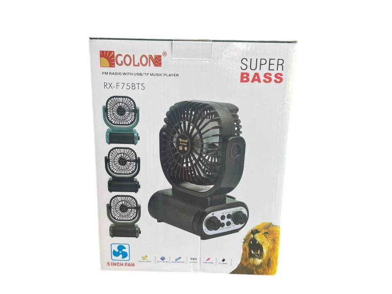 Соларно радио-вентилатор GOLON RX-F75BTS - Енергия от слънцето и кристален звук ☀️🔊🌬️Осигурете си музика, хлад и автономност навсякъде с GOLON RX-F75BTS - иновативно соларно радио с вграден вентилатор, Bluetooth и мощна батерия.Многофункционален звуков център и охлаждане 🎶❄️FM радио и музикален плейър Вграден FM тунер за любими радиостанции USB/TF слот за MP3 файлове и връзка към компютър Безжична свързаност Bluetooth & 5.3G аудио за стрийминг от смартфон TWS Group Player - свържете две устройства за стерео звук Мощен 3-лентов високоговорител Богат бас и чисти високи честоти Поддръжка на USB-TF-PC входове Соларно зареждане и дълготрайна батерия 🔋☀️Литиева батерия 18650 (1800 mAh) Вградена 18650 Li-Po батерия за до няколко часа възпроизвеждане DC вход 3.7V за бързо зареждане Соларен панел Интегриран соларен панел за допълнително захранване Идеално за къмпинг, преходи и извънградски условия Аксесоари в комплекта 📦 1× 18650 литиева батерия 1× Type-C кабел за зареждане