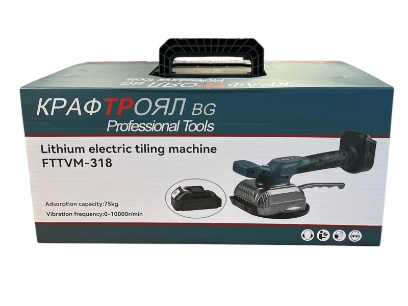 Акумулаторна вендуза за плочки KraftRoyal 36V 8Ah с нивелация 🧱🔋 Акумулаторната вендуза KraftRoyal 36V 8Ah е професионален инструмент, създаден за лесна и безопасна работа с тежки материали - керамични плочки, гранитогрес, мрамор, гранит, стъкло и други. С товароносимост до 75 кг и вградена нивелация, тя осигурява прецизно подравняване и удобство при монтаж. ⚡ Основни предимства: Максимален капацитет на повдигане: 75 кг Широка вендуза 13 см с 6 регулируеми степени 36V Li-Ion батерия, 8.0Ah - дълъг живот и мощност Време на зареждане: 2 часа Работно време: до 9 часа Компактна и удобна - тегло само 2 кг Удобна работа с една ръка 🎯 Приложение: Монтаж на плочки и гранитогрес Работа с мрамор, гранит и стъкло Подходяща за професионалисти и домашни майстори 📦 Комплектът включва: Вендуза - 1 бр. Батерии 36V 8Ah - 2 бр. Зарядно устройство - 1 бр. Пластмасов куфар за съхранение