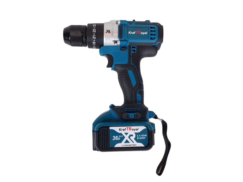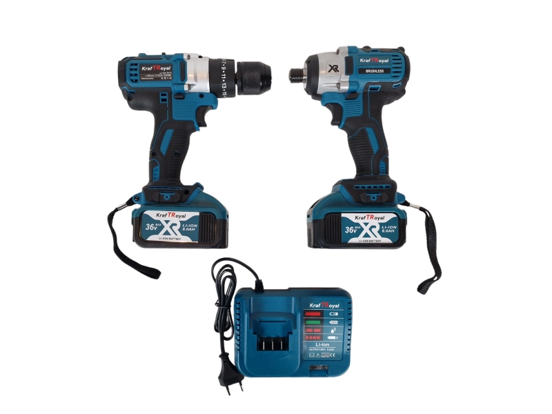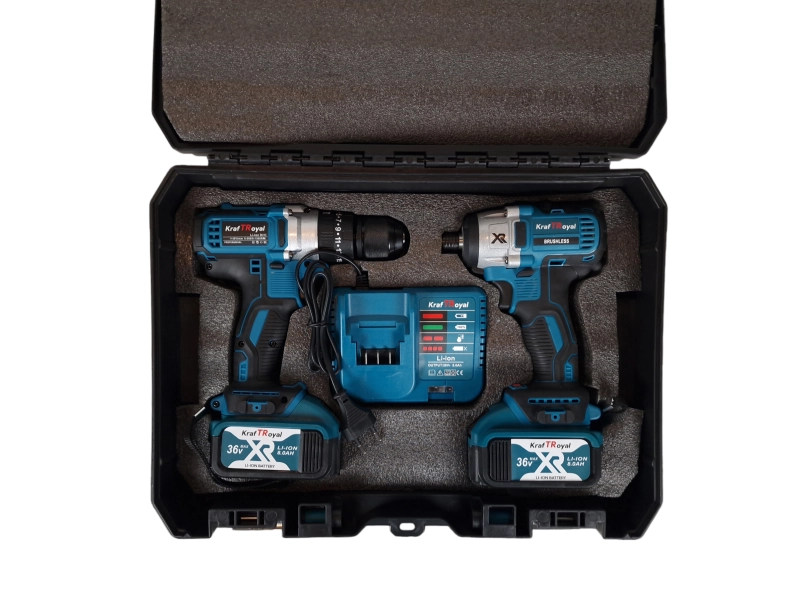 Акумулаторни безчеткови импакт и винтоверт 36V 8AH в куфар KRAFTROYALХарактеристики на Импакт :Напрежение: 36 VКапацитет на батерията: 8.0 AhВид на батерията: Li-IonВид на мотора: безчетковМакс. въртящ момент: 120 NmНиско тегло и изключителна ударна сила.Компактният и лек дизайн осигурява отлично управление и маневреност при работа с инструмента.Ергономичната ръкохватка с меко гумено покритие осигурява по-удобна работа и по-голям контрол.Вградена светодиодна подсветка с функция за допълнително осветяване.Удобен пусков ключ, който спомага за намаляване на умората на пръстите при продължителна работа с инструмента.Подобрена система за защита от прах и влага, подходяща за използване на уреда при тежки условия на работа.Три степени за избор ма мощността на ударно завинтване.Индикатор за състоянието на акумулаторната батерия.Характеристики на винтоверта:Напрежение на акумулаторната батерия: 36VКапацитет на батерията: 8000 mAhMax. въртящ момент: 72 NmПатронник: До 13 ммОбороти: 0 – 650 r/minОбороти: 0 – 2000 r/ minТегло: 2.3 кг Подходящ за всякакви ремонтни дейности.Три режима на работа : пробиване, ударно пробиване, завиване на винтове.16 степенно регулиране на момента в режим винтовертРеверс на посоката на въртене (ляв / десен ход).Гумирана ергономична ръкохватка за по добър захват при работа.Самозатягащ метален патронник за лесна смяна на принадлежностите.Електронно регулиране на оборотите.Комплектът съдържа:1бр. Акумулаторен импакт1бр. Акумулаторен винтоверт2бр. Акумулаторни батерии1бр. Зарядно1бр. куфар