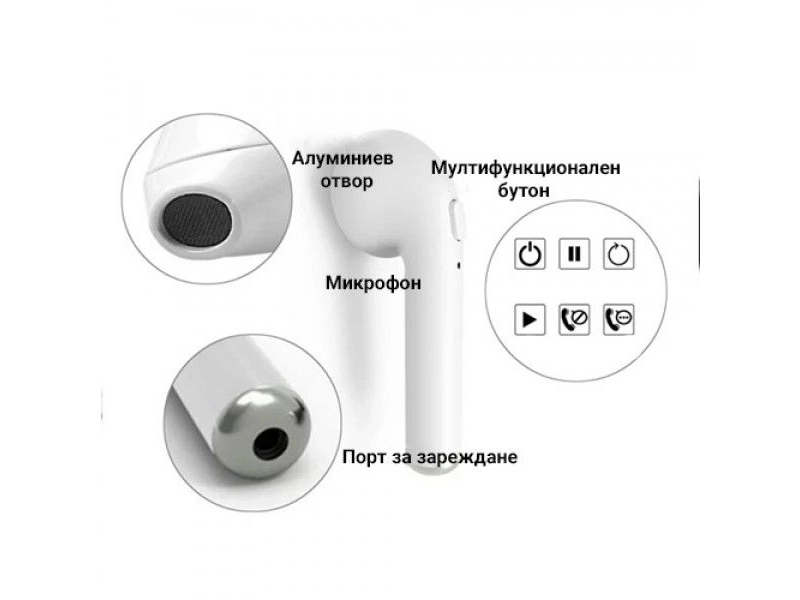 Описание:Представяме Ви i7 TWS - безжични слушалки със зареждащ кейс V4.2+DERУдобни слушалки-близнаци, необходима вещ на всеки шофьор, побрана в удобна кутия-зарядна станция.Двете слушалки се прибират удобно в кутийката, която е същевременно и зарядна станция.Първо зареждате зарядната станция-кутия, и когато имате нужда натискате бутона и кутията започва да зарежда слушалките, така може да зареждате слушалките дори и да няма наличие на захранване близо до вас.Зареждането на предпазната кутия става чрез кабел от комплекта micro USB към USB 2.0 от порт на компютър или лаптоп.Всеки телефон с Bluetooth 4.0 и 4.1 версия може лесно да се свърже със слушалката и безжично да разговаряте.Слушалките може да се свържат с лаптоп, компютър или всяко едно устройство което поддържа Bluetooth 4.1 и да слушате музика например.Светлинен индикатор за работеща слушалка. Слушалките може да се ползват и от два различни телефона.Слушалките и зарядната станция са снабдени с висококачествени вградени презареждаеми батерии - 65MAH на слушалките и 950MAH на зарядната станция.Характеристика:Дължина на кабела за зареждане: 20 см.Bluetooth версия V4.1+EDRЧестота: 2.40GhzTransmit power: Class2Разстояние на работа: 12 м.Време за зареждане: Около 1-2 часаВреме за разговор: Около 5-6 часаВреме в готовност: Около 120 часаРазмер на слушалката: 20 х 45 мм.Чувствителност на микрофона -42Transmit power: Class2Разстояние на работа: 12 м.Време за зареждане: Около 1-2 часаВреме за разговор: Около 5-6 часаВреме в готовност: Около 120 часаРазмер на слушалката: 20 х 45 мм.Чувствителност на микрофона -42DbРазмер на зарядната кутия: 52 х 70 мм.Работна температура -10-55 градусаТегло с кутията: 70 гр.Тегло на двете слушалки: 14 гр.Капацитет на батерията 65mAh/950mAhКомпектът включва:Зарядна станция-кутия2бр. слушалки близнациUSB кабел за зарежданеТранспорна кутияТранспорна кутия