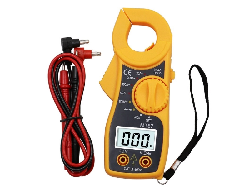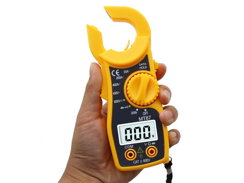 Мултимер клещи MT87 Обхват за измерване на постоянно напрежение DC: 600V ±1% Обхват за измерване на променливо напрежение АC: 450V ±1,2% Обхват за измерване на променлив ток АC: 2/20/200/400A ±2,5% Обхват за измерване на съпротивление: 200Kohm ±1% Захранване: (AAA) 1.5V - 2 броя - включени; Цифров LCD дисплей: 3 знака, максимално число: 1999; Наличие на диоден тест,зумер и задържане на показанията Data hold; Захранване: 2x1,5V(AAA) Размер: 150x63x28мм