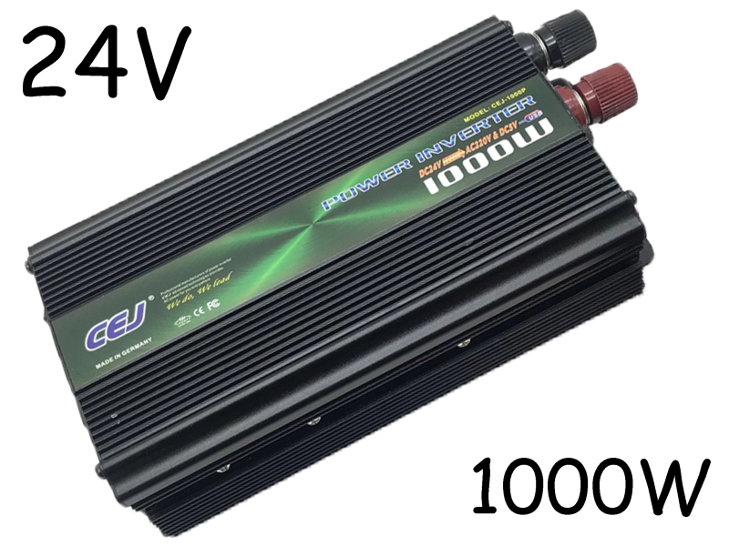 Инвертор на напрежение от 24V на 220V с мощност 1000WПреобразувателя на напрежение е подходящ за лек автомобил, каравана, кемпер и е много надеждно устройство, има защита от претоварване, късо съединение и прегряване.Електрониката е разположена в масивен алуминиев корпус и се охлажда допълнително от вентилатор.С този инвертор получавате бюджетно и надеждно решение за захранване практически навсякъде на различен тип устройства и потребителска електроника: преносими компютри, зарядни устройства, телевизори, видео и DVD плеъри, игрови конзоли, малки инструменти и др., работещи на 220 VAC. Той разполага с висока пикова мощност. Компактният дизайн, металния корпус и сравнително ниското тегло позволяват употребата му в различни среди. Вградените защити предпазват вашите устройства от повреди, а защитата за изтощена батерия предпазва от дълбоко разреждане на батерията, използвана за захранване. Така Вие ще сте сигурни, че разполагате с достатъчно заряд, за да стартирате Вашето превозно средство.Технически характеристики:Модел: CEJ 1000P 24VВходящо напрежение: 10 - 15 VDCСтойност на тока в режим"stand by": 0.3 AИзходно напрежение: 220 VACИзход: контакт 220V.Изход: USB порт 5 V.Изходна форма на вълната: Модифицирана синусоидаЧестота на изхода: 50/60 HzИзходна мощност: 1000 WЕфективност (КПД): 95 %Термична защита: 60 +/- 5 ℃Защита при пренапрежение: ДА, микрорегулаторБърза защита при пренапрежение: ДА, микрорегулаторВисоковолтова входна защита: ДА, микрорегулаторЗащита на поляритета на батерията: ДА, чрез предпазителВнимавайте!Мощността на уреда, който захранвате да не превишава мощността на използвания инвертор на напрежение! Номиналната мощност на инвертора да е с до 30% по-висока от мощността на консуматора. Инверторът не трябва да бъде включен при запалване (стартиране) на превозната средство. При неспазване на тези условия инвертора може да бъде претоварен или повреден и гаранцията няма да покрива повредата!