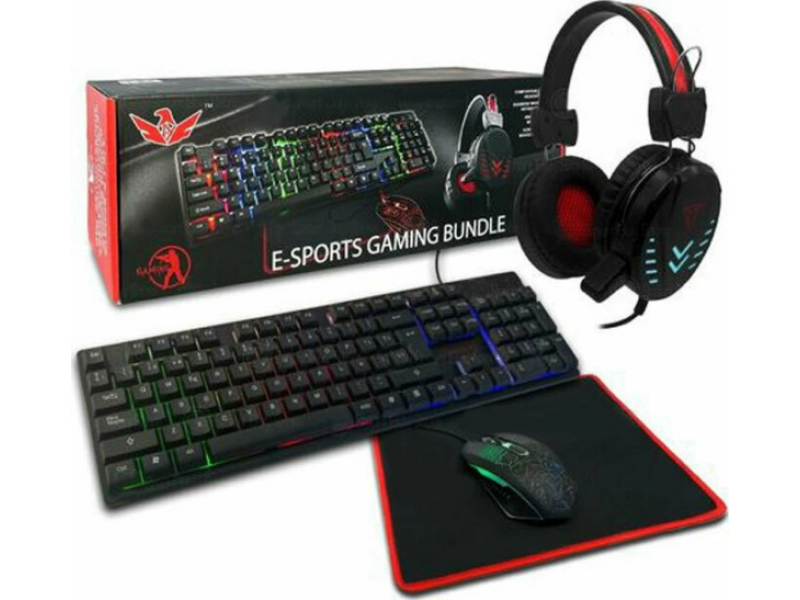 Съвместим с лаптоп и компютър пакет от 4 частиСпецификации:Представяме ви този страхотен комплект, задължителен за всеки един геймър.По време на работа излъчва разноцветна LED светлина, чиито интензитет не може да бъде регулиран.Включва и се изключва от бутона Scroll в горния десен ъгъл на клавиатурата.Съвместим е със следните операционни системи: WINDOWS 7, WINDOWS XP, WINDOWS 2000, WINDOWS 8, MAC OS, WINDOWS 10 и WINDOWS VISTA.Свързване: USB 2.0, поддържа 3.0Цвят: ЧеренТегло на целия комплект в кутията: 1,420 кг.Важно: При операционна система MAC, САМО светлините не се включват, тъй като устройството е проектирано под параметрите на WINDOWS.Комплекта включва:1 бр. Мишка с кабел.1 бр. Клавиатура с кабел.1 бр. Слушалки с кабел.1 бр. Подложка за мишка.