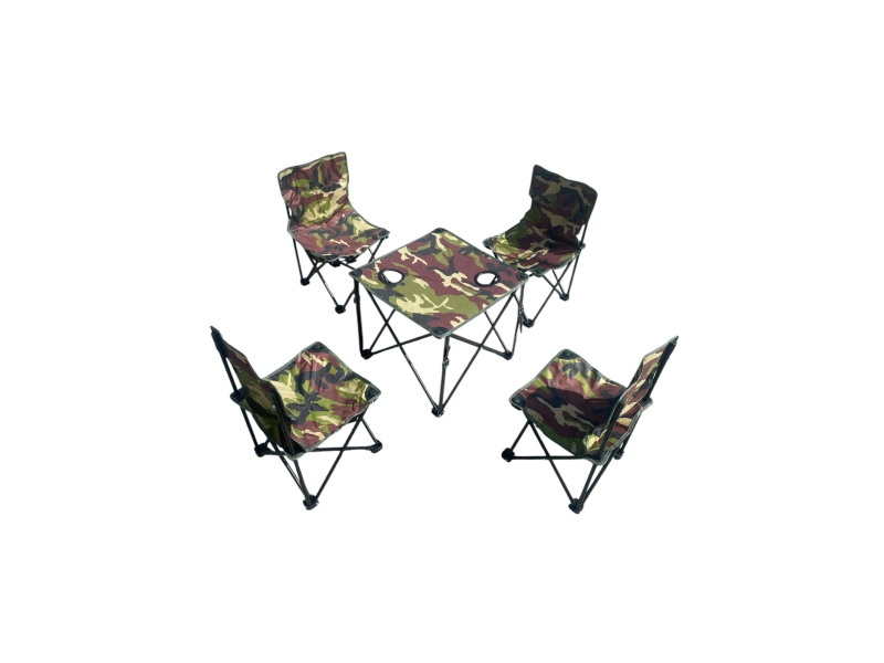 Този комплект къмпинг е идеален за любителите на открито и приключения. Състои се от сгъваема маса с камуфлажен дизайн и четири удобни стола, които се сгъват за лесно съхранение и пренасяне. Може да се използва при къмпинг, пикници, риболов, барбекюта или всякакви други дейности на открито.