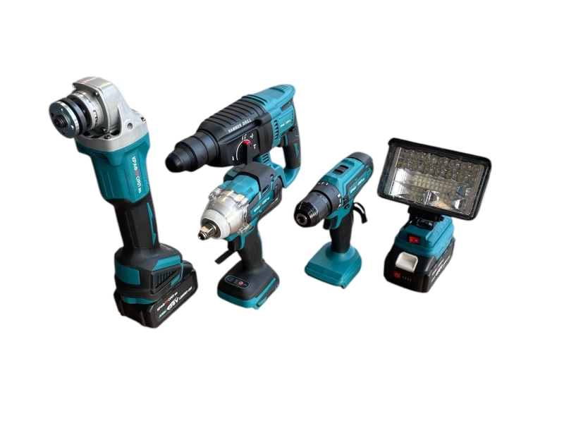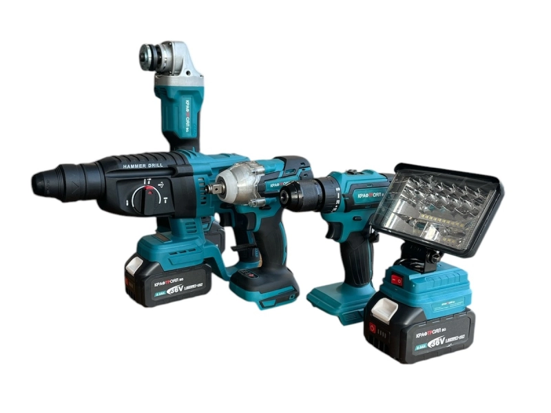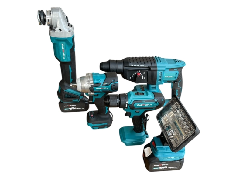 Комплектът включва акумулаторен перфоратор, ъглошлайф, гайковерт, винтоверт и работна лампа.