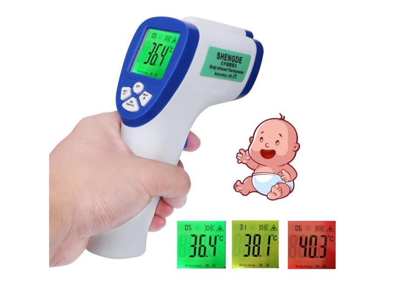 - Безконтактен инфрачервен термометър с LED дисплей и трицветна подсветка за лесно разчитане на температурата