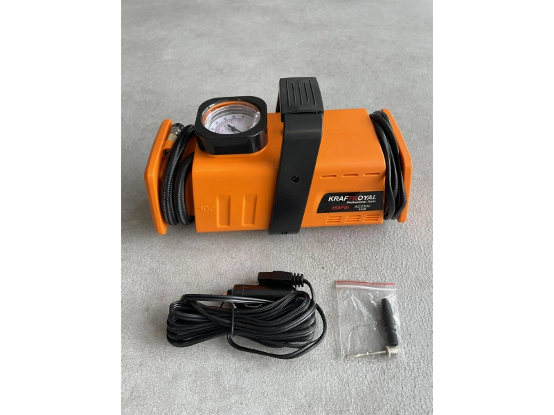 Открийте удобството с компресора за гуми KraftRoyal 7 Bar! 🚗 Компактен и лесен за пренасяне, той е идеален за автомобили, бусове, джипове, скутери и велосипеди. С включени накрайници за надуваеми дюшеци и топки, ще бъдете готови за всяко приключение. Антивибрационните крачета осигуряват стабилност при работа. Захранвайте го удобно от автомобилната запалка или електрическата мрежа. Не чакайте, осигурете си спокойствие на пътя днес!