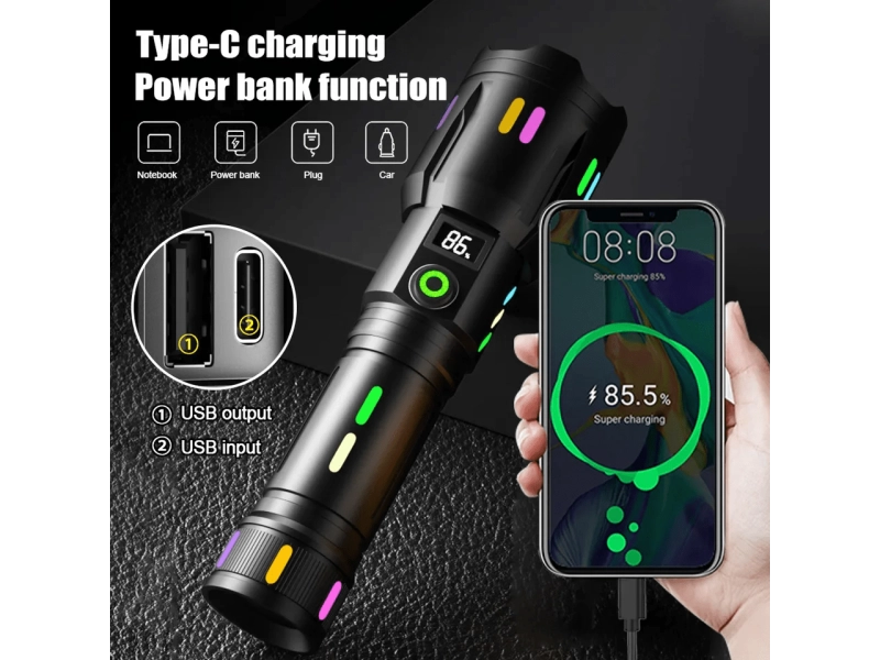 Мощно акумулаторно фенерче, което носи светлина дори в най-дълбоките кътчета на тъмнината с впечатляващата си мощност и обхват до 3000 метра. Идеален избор за авантюристи, туристи, ловци, рибари или всеки, който търси надежден и мощен източник на светлина.Ослепителна яркост: Голямата мощност и дългият обхват ви позволяват да осветявате дори най-отдалечените цели с лекота.Регулируем фокус: Чрез регулиране на фокусното разстояние можете да фокусирате светлинния лъч до желаната ширина, така че да виждате ясно близки и далечни обекти.Няколко режима: Изберете от висока, ниска и мигаща светлина блиц според ситуацията.Акумулаторна: Благодарение на вградената батерия вече не е нужно да се притеснявате за батериите. Просто свържете предоставеното зарядно устройство и то е готово за употреба отново.Водоустойчивост: Благодарение на водоустойчивостта IPX4, фенерчето е устойчиво на дъжд и пръски вода, така че можете да го използвате при всякакви метеорологични условия.Издръжливост: Корпусът, изработен от алуминиева сплав, е здрав и издръжлив, така че фенерчето ще ви служи дълги години.Технически характеристики:- Дължина на фенера - 20 см.- Материал на тялото: Алуминиева сплав- Източник на светлина: LED технология TG LED- Дистанция на осветяване: до 3000м- Режим на превключване: Силна светлина , слаба светлина и мигаща светлина блиц- Батерия: Li-lon 26650 8800 mAh 4.2 V- Водоустойчив: Да- Мащабиране: Да- Метод на зареждане: USB- Може да се използва като преносима батерия и да зареждате вашия телефонКомплекта включва:- 1бр. Акумулаторен фенер- 1бр. Зарядно устройство- 1бр. Батерия 26650