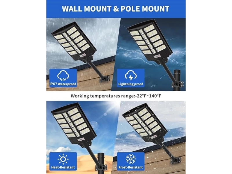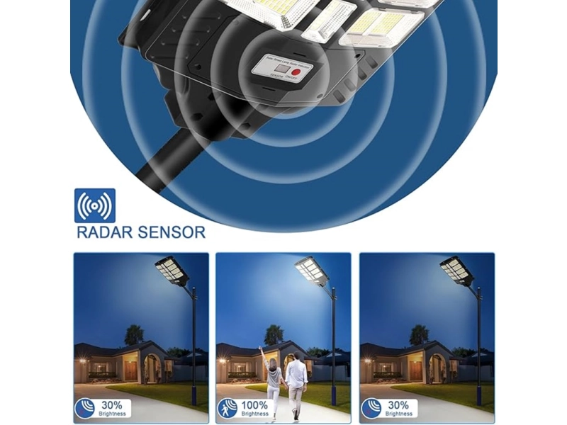 Соларната LED лампа LYLU 1400W е мощно и енергийно ефективно решение за осветяване на дворове, улици, паркинги, градини и индустриални обекти. С 780 COB диода, висока яркост и интелигентни режими на работа, тази лампа осигурява оптимално осветление при всякакви условия.Основни характеристики:✔ Брой диоди: 780 – ултраярко осветление с 6500K студена бяла светлина. ✔ COB мощност: 1400W – по-ярко и по-икономично осветление. ✔ Широкоъгълно осветление: 220° двупосочно разпределение на светлината за максимално покритие. ✔ Брой секции: 25 – равномерно разпределение на светлината без тъмни зони. ✔ Водоустойчивост: IP65 – издръжлива на дъжд, сняг и екстремни метеорологични условия. ✔ Температурен диапазон: от -20°C до +65°C, подходяща за всякакъв климат. ✔ Издръжлив материал: PVC / ABS – устойчив на удари и корозия. ✔ Размери: 61 x 35 x 7.5 см – компактна и лесна за монтаж.Интелигентни режими на работа:Режим на сензор за движение – лампата свети на 100% яркост при засечено движение и намалява до 30% след 15 секунди.Режим "От здрач до зори" – автоматично включване при здрач и автоматично изключване при изгрев.Режим на синхронизация – настройка на време чрез дистанционно управление: 2 / 3 / 5 / 6 / 8 часа, както и регулиране на яркостта от 25% до 100%.Защо да изберете LYLU 1400W?✔ Работи изцяло със слънчева енергия – без нужда от електрическо захранване! ✔ Подходяща за различни приложения – улици, паркинги, градини, вили, строителни обекти. ✔ Лесен монтаж – без нужда от допълнителни кабели.Осветете големи пространства с минимални разходи за енергия!