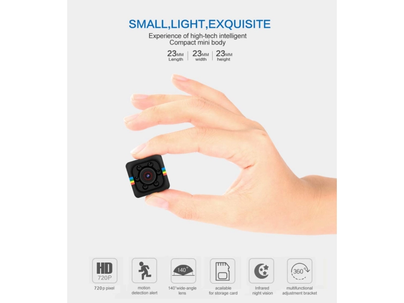 Тази мини камера е идеалното решение за дискретно и удобно наблюдение в различни ситуации, като предлага висока резолюция и възможност за запис при слаба светлина. Благодарение на компактния си размер, камерата може да бъде монтирана на труднодостъпни места, като например върху дрехи, каска, кола или други подвижни и неподвижни обекти.