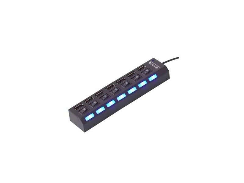 Универсален USB 2.0 хъб / разклонител с 7 порта за USB устройства. Всеки порт притежава собствено копче за включване и изключване