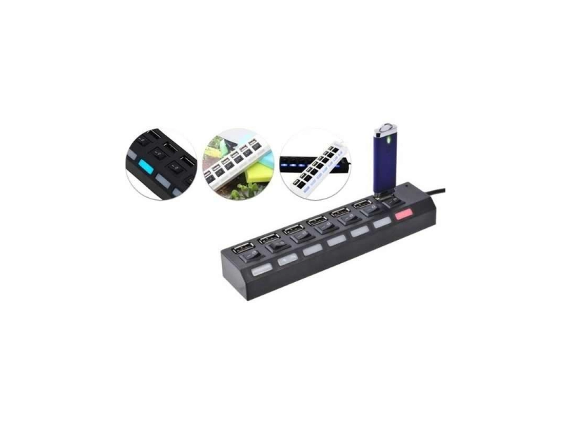USB разклонител със 7 активни портаВсеки порт притежава собствено копче за включване и изключване.7 LED индикатора показващ статуса на хъбаЗащита от претоварванеВисока скорост на трансфер, над 480MbpsИнтерфейс: USB 2.0, USB 1.1Възможност за допълнително захранване с адаптер 3.5 mm 5V/1A ( не е включен )Дължина на USB кабела: 54см.Размери на порт хъба: 165х31х23мм.Цвят: Черен и бял