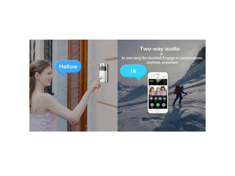 С включен PIR датчик за движение: когато някой се движи около вратата, звънецът незабавно ви предупреждава с известие на мобилния ви телефон Висококачествен двупосочен разговор с външния човек, с функция шумопотискане Видео звънецът разполага с три акумулаторни батерии със спецификация 18650. Те се зареждат с USB кабел, който може да включите в контакта Над милион HD пиксели съчетани с широкоъгълен обектив от 166 градуса. Поддържа функция за бързо събуждане на мобилния телефон в рамките на 1 секунда. 2.4G Wi-Fi връзка Дневен и нощен режим с автоматично превключване, независимо дали e ден или нощ, изображението е ясно видимо, за вашата безопасност и семейна сигурност Монтаж: Монтиране на стена Размер на сензора (инч): 1/4 инча Звънец: Да Метод на свързване: Безжичен Водоустойчивост: Да Вид на щепсела: ЕС щепсел Детектор за движение: Да Модел: WiFi видео звънец с камера и интерком връзка със смартфон Мощност: Консумация на енергия в режим на готовност 400uA Технология: Цифрова Материал: ABS Интерфейс за IP камера: Не Комуникационен интерфейс: Безжичен Тип камера: CMOS Размери: 144 * 74 * 32 мм (5.6 * 2.9 * 1.3 инча) Ъгъл на видимост (°): 160 градуса Резолюция: 720P Мощност: 18-24V AC захранване. Захранване: 3 броя батерии със спецификация 18650 (Включени в комплекта!). Активиране: Натискане на бутона / Чрез PIR датчика за движение/ Чрез мобилното приложение