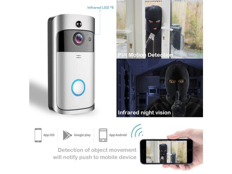 С включен PIR датчик за движение: когато някой се движи около вратата, звънецът незабавно ви предупреждава с известие на мобилния ви телефон.