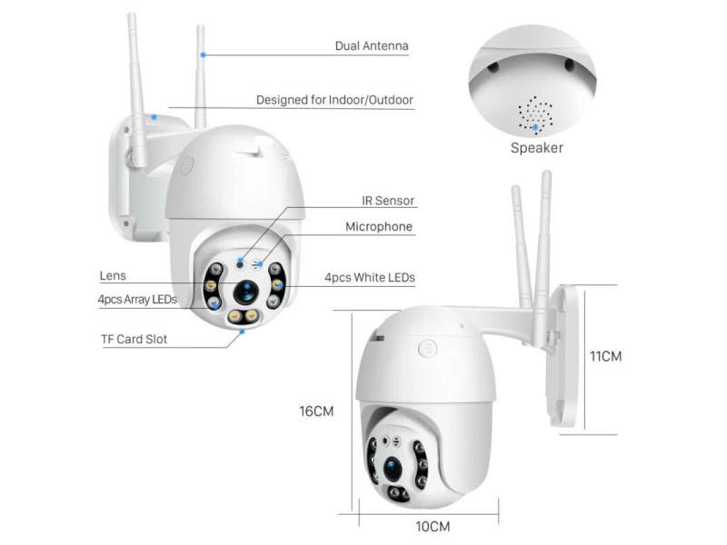Външна въртяща WiFi AI камера 5MP ICSee Бяла - Интелигентно видеонаблюдение 📹Осигурете си пълна сигурност на дома или бизнеса с тази моторизирана PTZ WiFi камера с резолюция 5MP, интелигентно проследяване и IP66 защита.Лесен монтаж и управление 🛠️ Свързване директно към вашата 2.4 GHz/5 GHz WiFi мрежа Инсталира се за няколко минути без допълнителни устройства Стабилен стенен монтаж, издържащ на дъжд, сняг и прах Панорамно покритие и автоматично проследяване 🔄 Завърта се 355° хоризонтално и 110° вертикално Intelligent Tracking следи хора, домашни любимци и движещи се обекти Отдалечено управление през приложението iCSee или XMEYE Интелигентни аларми и нотификации 🚨 Откриване на движение и звук с моментални push известия Филтриране на фалшиви аларми - разпознава само хора Настройване на график за аларми в определени часове Качество на изображението и аудиото 🎥🎤 Full HD (5MP) за детайлен и ясен образ Инфрачервено нощно виждане до 25 м Двупосочно аудио ("уоки-токи") за реално слушане и говорене Съхранение на записи на MicroSD до 128 GB и облачно Надеждност при всякакви условия ☔🌙 IP66 водоустойчивост - защита от прах и вода Здрава метална конструкция с гумени уплътнения