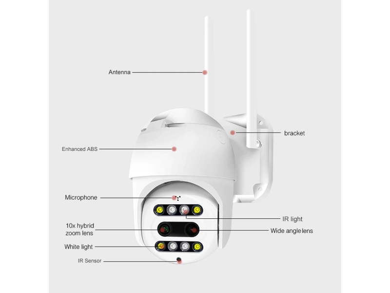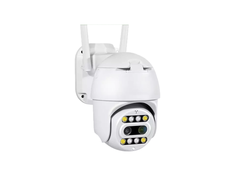 Изкуствен интелект: Wifi камерата Dual Lens PTZ e водоустойчива и е подходяща за външни условия, може да се настрой и монтира за няколко минути, без необходимост от допълнителни устройства или кабели. Защитата за водоустойчивост е IP66. Разполага с две лещи, това дава възможност за висококачествено приблежение от X 10 пъти. С този модел можете да разчетете номер на автомобил от над 30 метра. За първи път в България Засича движение и изпраща известия: Предимството през оптичните камери е, че можете да превкючите на максимално приближение и настройката да остане така, дори да излезнете от приложението. По този начин ще записва на далечно разстояние, без да размазва образа. Камерата е моторизирана и се завърта във всички посоки. Управлението става директно, чрез смартфона – отдалечено. Улеснена инсталация без изискване за допълнителни познания. Има пълни инструкции на български език. Камерата изпраща нотификации при засичане на движение и звук, директно на смартфона, чрез приложението с което работи. Автоматичен нощен режим. Лесно и умно управление: Безжична (WiFi) връзка с интернет Камерата за видеонаблюдение се свързва с Интернет и предава видео безжично. Единственото, което трябва да направите, е да я включите в контакт. Изключителна лесна инсталация за 5-10 минути. Микро SD слот за съхранение на видеозапис до 128GB. Двупосочно аудио ( предава и приема звук с високо качество) FULL HD резолюция. Възможност за съхранение на записа в Cloud Функция нощно виждане (нощен режим, с infrared и Led диоди) Функция Alarm Push Функция Motion detection (изпраща известие при засечено движение) Завъртане: 355° и вертикала: 70° Два обектива за перфектна видимост на големи разстояния