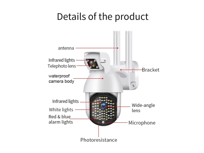 Външна Водоустойчива Камера Wifi Full HD 2.0MP 50 LED 355° автоматично въртяща се с 2 подвижни лещи от ново поколение! ЦВЕТНО НОЩНО ВИЖДАНЕ! Широкообхватна! Перфектно качество и на нощен запис! До 8 пъти ZOOM! IP66 влаго и водоустойчивост! Inteligent tracking за автоматично завъртане и следене на обекти. Лесно и бързо свързване с телефон! Гаранция 24м.!