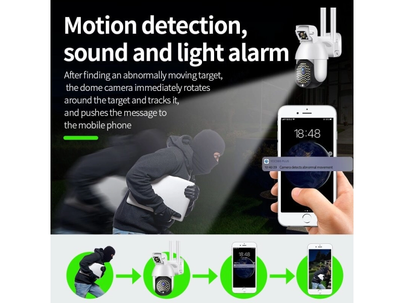 Външна Водоустойчива Камера Wifi Full HD 2.0MP 50 LED 355° автоматично въртяща се с 2 подвижни лещи от ново поколение! ЦВЕТНО НОЩНО ВИЖДАНЕ! Широкообхватна! Перфектно качество и на нощен запис! До 8 пъти ZOOM! IP66 влаго и водоустойчивост! Inteligent tracking за автоматично завъртане и следене на обекти. Лесно и бързо свързване с телефон! Гаранция 24м.! ХАРАКТЕРИСТИКИ: Камерата притежава функцията Motion Tracking + Inteligent tracking (автономно завъртане и следене на обекта), а не само моушън детекшън ( нотификации при движение в обсега на камерата). Камерата използва приложението Icam 365 Чисто нови въртящи (PTZ) на 320° градуса по хоризонтала и 90° градуса по вертикала се безжични WIFI IP Full HD камери със резолюция 1920х1080 FULLHD, 2.0MP Lend , 3.6mm фокусПрахо-влагоустойчиви, покриват стандарт IP66 могат да бъдат поставени на открито. Снабдени с 50 ДИОДА, които могат да покрият до 30 метра видимост през тъмната част от денонощието. Интегриран слот за поставянето на микро карта (microsd) до 128гб капацитет, за запис на видео и/или снимки. Опция за свързване към WiFi рутер и гледане дистанционно посредством мобилни данни или WiFi връзка на телефона. Вграден сензор за движение при, който камерата може да записва единствено и само когато има движение пред нея. В камерата е монтиран микрофон и високоговорител, така че да слушате какво се случва около камерата, а посредством високоговорителя можете от телефона да говорите и да се възпроизвежда от камерата.Спецификация:- Видео резолюция 1920х1080 fullhd, Lens, 2.0MP Image 3.6mm фокус- Сензор - HI3518E+SC2235 15fps- Свързаност - безжично през WiFi 2.4g b,g,n до 50 метра в зависимост от сградите, жично през LAN/UTP/ кабел.- Подръжка на ONVIF протокол /камерата може да бъде звързана към мрежов видео рекордер NVR.Софтуер:- Бърза и лесна настройка в рамките на 5 мин. Приложенията разполагат с богата гама от различна конфигурация на камерите.- Сензор за движение - 3 типа чувствителност /ниска, средна, висока/. Известяване на телефона при наличието на движение. -Дистанционно гледане на записаните видео клипове или снимки от картата памет през приложението.- Качество на записваните видео клипове: 6 степени.- Време на записване при движение - от 5 до 120 мин + запис на звук, презапис при запълване на картата памет- Скорост на въртене на камерата - слабо, нормално, бързо.- Камерите предоставят достъп през WEB интерфейс по IP адреса, който взема.Комплекта включва: PTZ /въртяща камера/, захранващ адаптер 12v, 2a * Гаранция: 24 месеца