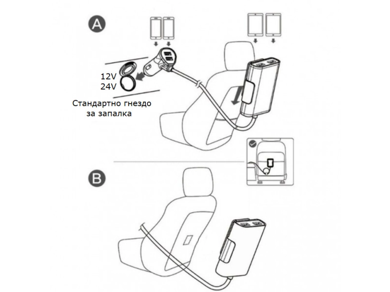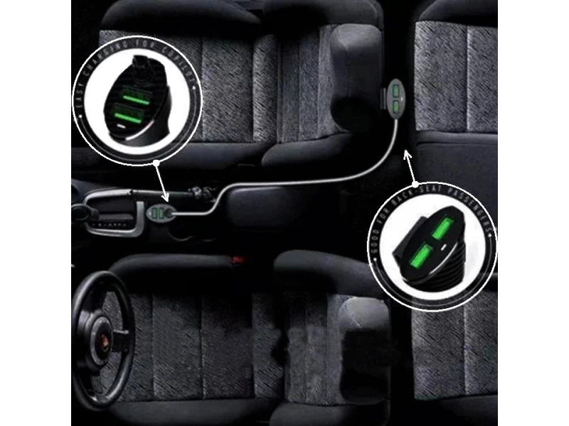 USB зарядно за кола с 4(2+2) USB порта с удължител за пътниците на задните седалки