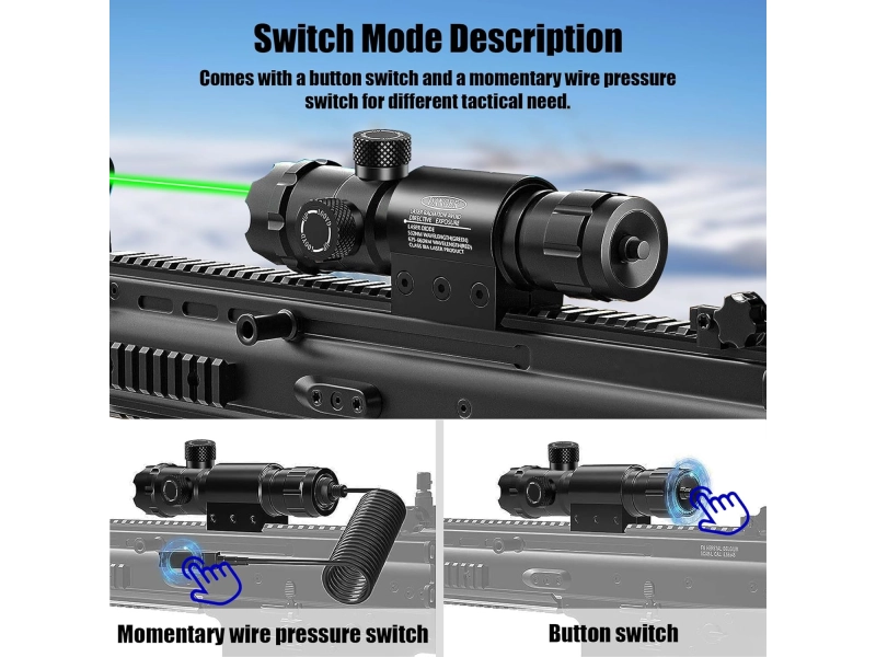 Устройството е с 2 режима на превключване- с бутон в задната част на лазерния прицел и ли чрезсменяем превключвател /дистанционен бутон/, който позволява на потребителя да използва от разстояние.